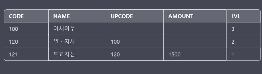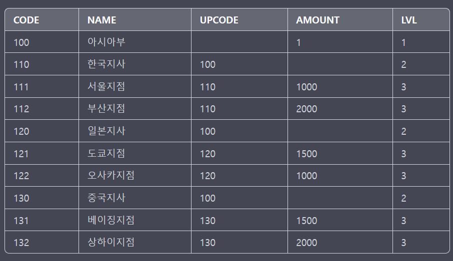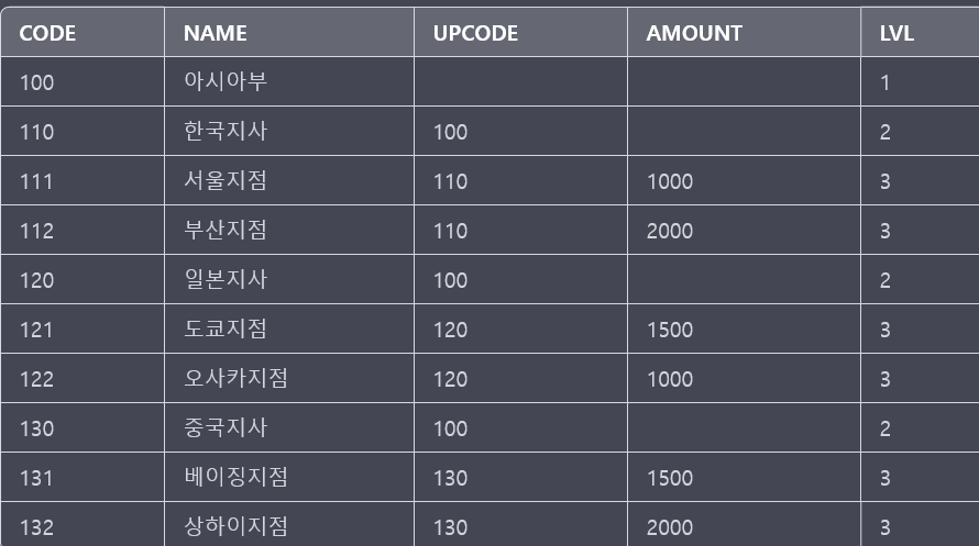 SELECT code, name, upcode, LEVEL AS LVL --- (2)번 SELECT 문