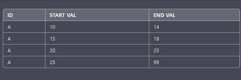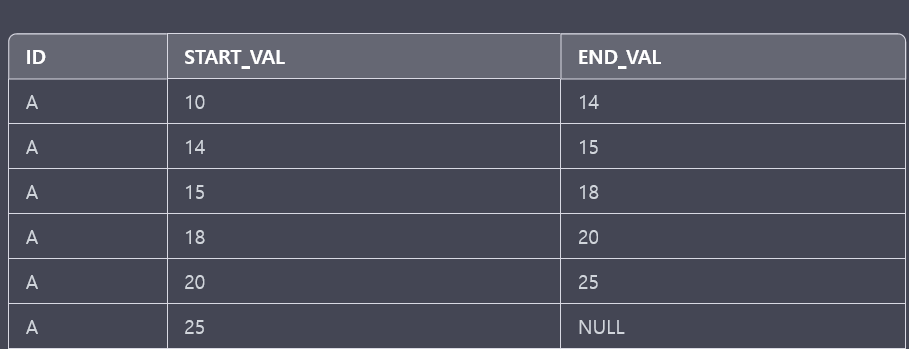 그럼 저 테이블과 동일한데 END_VAL의 마지막 값만 NULL 대신 99인겁니다.