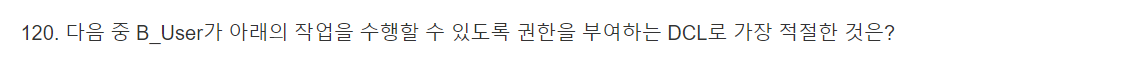 따라서, B_User가 아래의 작업을 수행할 수 있도록 권한을 부여하는 DCL로는 4번이 가장 적절합니다.
