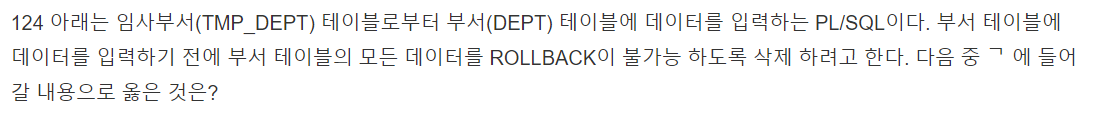 124 아래는 임사부서(TMP_DEPT) 테이블로부터 부서(DEPT) 테이블에 데이터를 입력하는 PL/SQL이다. 부서 테이블에 데이터를 입력하기 전에 부서 테이블의 모든 데이터를 ROLLBACK이 불가능 하도록 삭제 하려고 한다. 다음 중 ᄀ 에 들어갈 내용으로 옳은 것은?