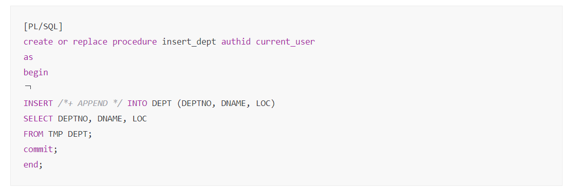 INSERT /*+ APPEND */ INTO DEPT (DEPTNO, DNAME, LOC)