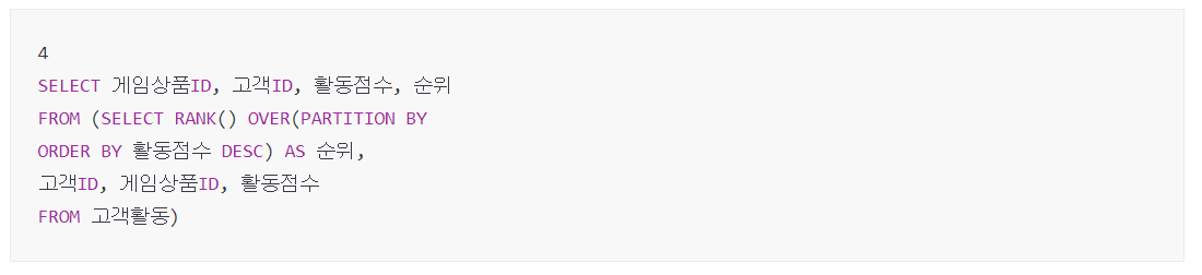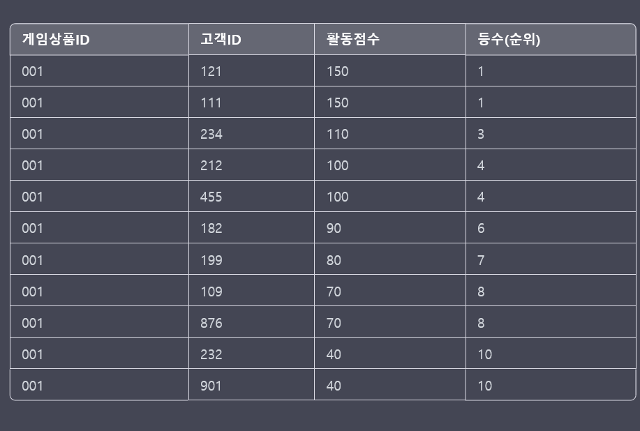 FROM (SELECT DENSE_RANK() OVER(ORDER BY 활동점수 DESC) AS 순위 고객, 게임상품ID, 활동점수