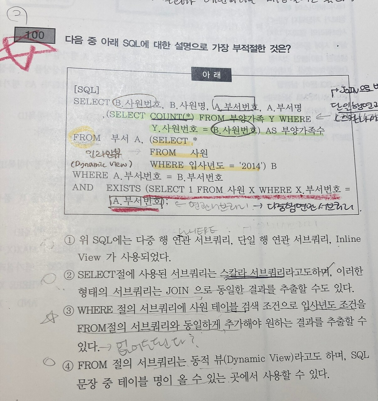 100번. 다음 중 아래 SQL에 대한 설명으로 가장 부적절한 것은?