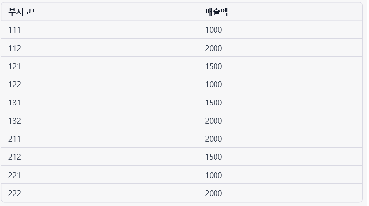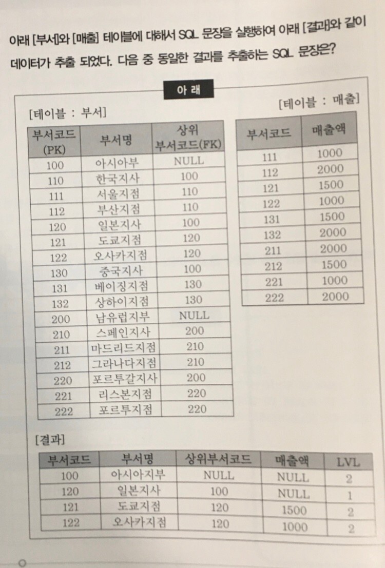 92번. 아래 [부서]와 [매출] 테이블에 대해서 SQL 문장을 실행하여 아래 [결과]와 같이 데이터가 추출되었다. 다음 중 동일한 결과를 추출하는 SQL 문장은?