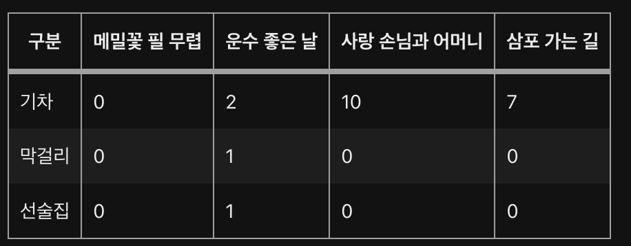 빈도 기반 임베딩 : 단어의 빈도를 기준으로 벡터로 변환, 운수좋은 날이라는 문서의 임베딩은 [2, 1, 1]입니다. 막걸리라는 단어의 임베딩은 [0, 1, 0, 0]이며, 사랑 손님과 어머니, 삼포 가는 길이 사용하는 단어 목록이 상대적으로 많이 겹치고 있는 것을 알 수 있습니다.
