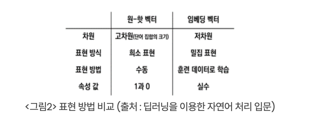 밀집표현(임베딩 벡터) : 사용자가 벡터의 차원(크기)을 맞춰 사용, 벡터값도 0,1이 아닌 실수값