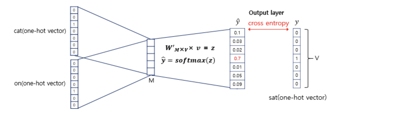 다중 클래스 분류 문제를 위한 일종의 스코어 벡터(score vector)입니다. 스코어 벡터의 j번째 인덱스가 가진 0과 1사이의 값은 j번째 단어가 중심 단어일 확률을 나타냅니다. 그리고 이 스코어 벡터의 값은 레이블에 해당하는 벡터인 중심 단어 원-핫 벡터의 값에 가까워져야 합니다. 스코어 벡터를 𝑦^라고 하겠습니다. 중심 단어의 원-핫 벡터를 𝑦로 했을 때, 이 두 벡터값의 오차를 줄이기위해 CBOW는 손실 함수(loss function)로 크로스 엔트로피(cross-entropy) 함수를 사용합니다. 크로스 엔트로피 함수에 중심 단어인 원-핫 벡터와 스코어 벡터를 입력값으로 넣고, 이를 식으로 표현하면 다음과 같습니다. 아래의 식에서 V는 단어 집합의 크기입니다.