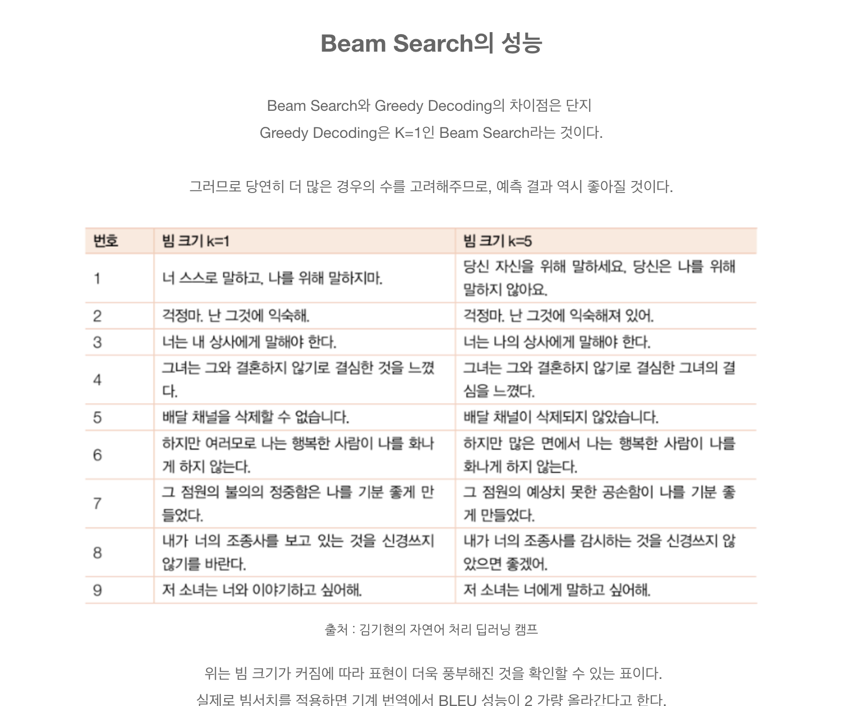 - Beam search : Greedy Decoding을 어느정도 극복하기 위해 사용, 빔서치에서 고려하는 모든 확률은 누적 확률, 유망한 빔의 개수만큼 (이하 K) 골라서 진행(https://blog.naver.com/sooftware/221809101199)