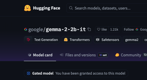 일부 모델은 사용 전에 라이선스 동의(usage license) 또는 액세스 요청(request access) 절차가 필요합니다. 예를 들어 google/gemma-2-2b-it 모델은 사용 전에 허가 조건을 동의해야 합니다.