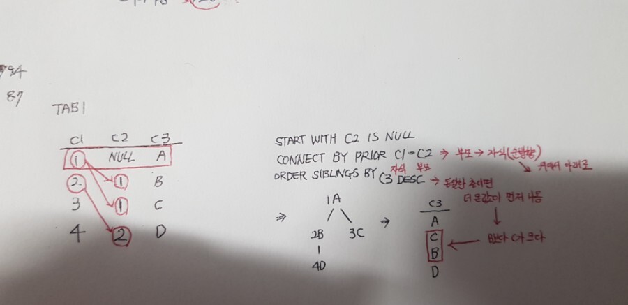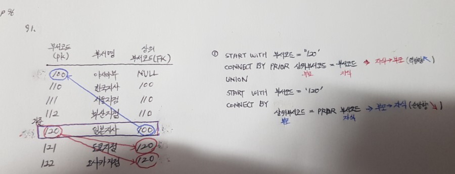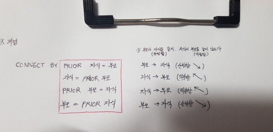 CONNECT BY PRIOR 부모 = 자식 ( 자식 -> 부모) ( 역방향 ↖)